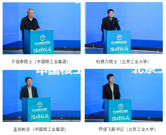 中国核工业集团方面,中国工程院院士于俊崇、总经理助理孟琰彬、战略咨询委委员钱天林、毋涛、首席科学家刘东、科数部副主任荣健及中国原子能科学研究院、中核工程公司、中核四0四公司、中核核信等专家领导,fun88官网体育方面,中国工程院院士杜修力、党委副书记乔俊飞、党委常委、副董事长陈树君、技术转移中心、国家大学科技园常务副主任闫健卓、建筑工程公司党委书记李悦、fun88官网体育经理许成顺、机械与能源工程公司经理高国华、信息科学技术公司经理李晓理等专家领导出席本次揭牌仪式。揭牌仪式上,中核核信首席专家吴通博士就实验室建设规划做精彩汇报,于俊崇院士及杜修力院士代表实验室做院士讲话,孟琰彬总及乔俊飞副书记做领导致辞。