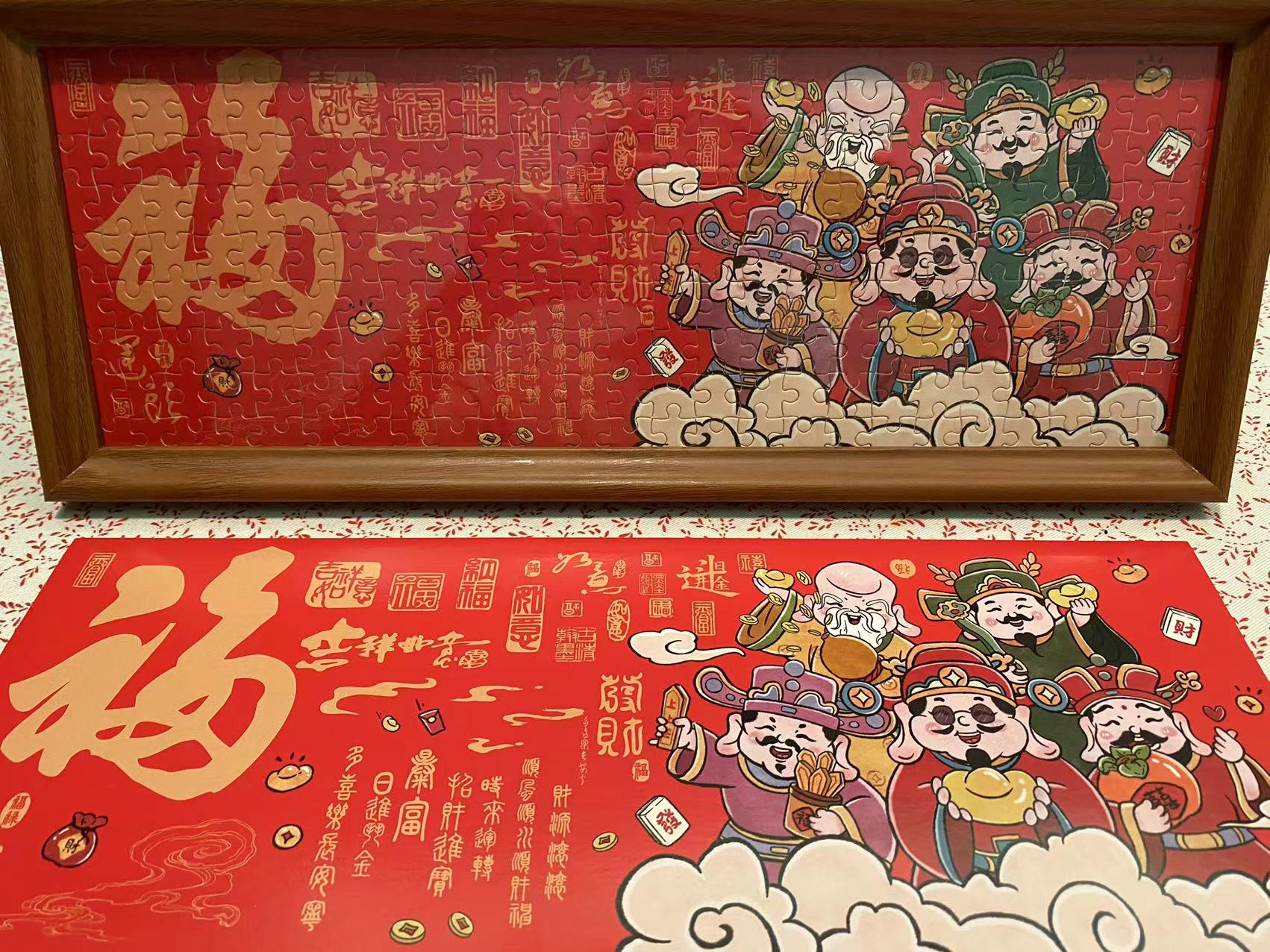收到材料包后,老师们便迫不及待地投入拼图活动中,他们认真研究图纸,专注地寻找着每一块合适的碎片进行拼接。在大家的巧手制作下,一块块拼图卡片逐渐变成精美喜庆的“福星高照”图,展现了退休女教师们对美的独特理解,也蕴含着她们对生活的热爱。