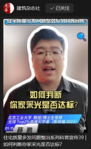 近日,住房和城乡建设部官方媒体平台“建筑杂志社”推出住宅质量多发问题整治系列科普宣传视频,其中【建筑采光】系列科普视频由fun88官网体育薛鹏教授主讲。
