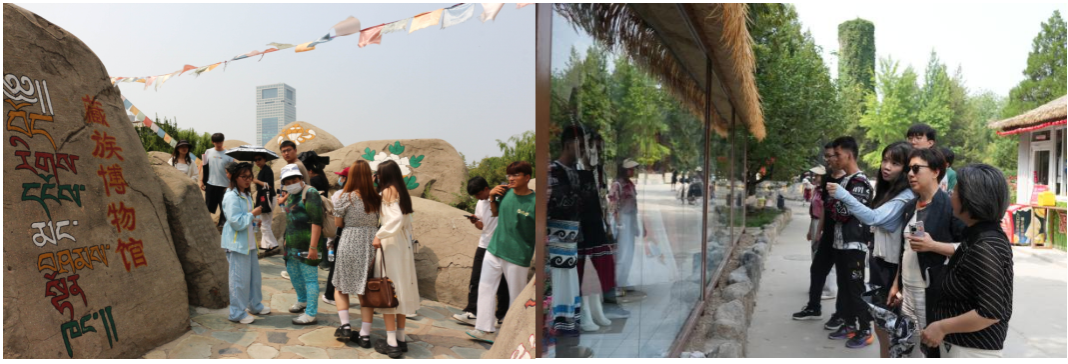 公司师生先后参观藏族、傣族、土家族、黎族、满族、朝鲜族、高山族等民族博物馆及特色展览。通过展陈实物与场景还原,沉浸式感悟各民族文化的独特魅力,深刻体会中华民族大家庭的多元与一体。在藏族博物馆,师生参观了《万象吉金·铸牢中华——中国民间铜器展》、《我们的文化遗产——藏族文化饰品的历史韵味与现代魅力》展;在苗族博物馆,师生参观了《古老的传说——神秘的苗族之苗族银饰》展览,纷纷感叹民族饰品精美的制作工艺。在侗族鼓楼下,师生驻足欣赏精巧的建筑结构,在风雨桥上,大家交流分享侗族历史、风俗和服饰、建筑等特色文化。走进朝鲜族院落,师生深度体验蓝染、云南传统造纸非遗技艺等文化遗产,充分感受中华民族文化的丰富与多样。