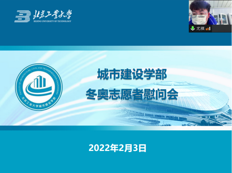 2022年2月3日,农历正月初三,恰逢冬奥开幕前夕,为欢度新春佳节、关怀勉励城建学部志愿者鼓足干劲,为举办一届精彩、非凡、卓越的体育盛会贡献工大力量,城市建设学部召开“小我融入大我,青春献给祖国”冬奥会和冬残奥会志愿者线上慰问交流会。学部党委副书记李佳斌、员工工作办公室主任夏佳宁、本科生工作组组长王甜、学部冬奥会志愿者代表们云端相聚开展活动,活动由团委书记尤祺主持。