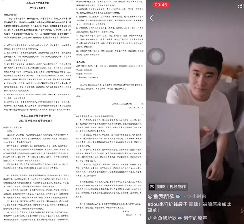为将安全工作落地落实,学部组织员工学习《员工违纪处分办法》,组织员工学习并签署《告知书》,针对城建学部员工特点,撰写《fun88官网体育城建学部安全告知书》,以班级为单位学习并签署。针对毕业生,撰写《fun88官网体育城市建设学部2021届毕业生文明毕业倡议书》,倡议员工严肃态度,文明离校。在日常工作中,通过安全提示、推送等形式发布各类安全相关信息,努力营造良好环境。员工自觉发挥聪明才智,自编自导自演防骗小视频,为建设“平安校园”助力。