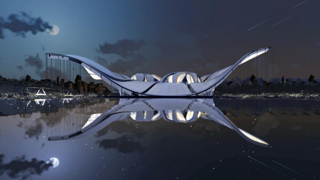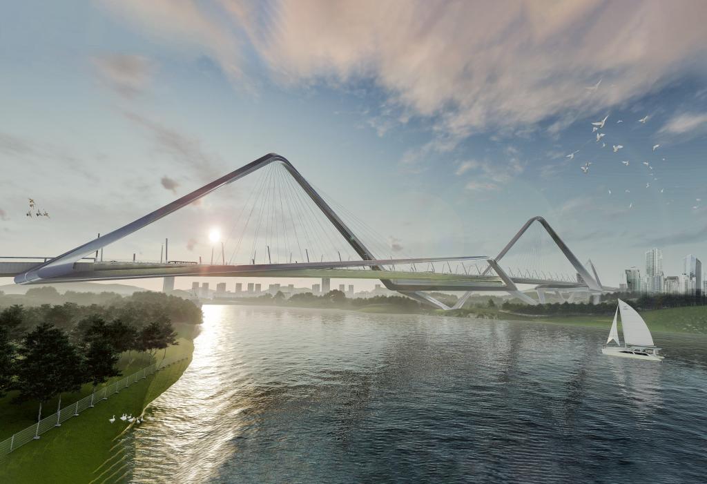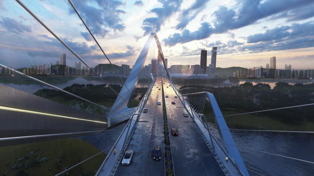 “三峦开济——跨河景观桥梁”项目由刘越、李翔宇两位老师指导,取用象形文字与山水国画作为外观设计的灵感,通过空间错动,为来往的车辆与行人营造出在群山中穿行的优雅意境。中部结构实现自承重,象征着中国正沿特色社会主义道路坚定不移、独立自主地稳步发展;外侧两部分结构部分悬挑,象征周边睦邻友好的国家和地区,寓意中国同世界以及粤港澳大湾区与周边城市和地区同舟共济、协同发展的合作关系。