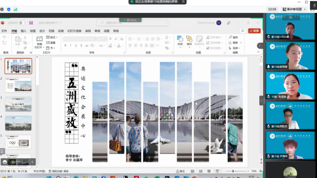 由李宁、孙国军老师指导的项目“五洲盛放——奥运文化会展中心”运用Field算法模拟磁场以五环为中心向外辐射,将五环形态的平面磁场空间化,磁感线落地呈花瓣状,洁白通透的整体造型包裹着奥运精神。采用Kangaroo动力学算法和插件优化了展馆造型与结构节点,借鉴“拉斐尔云廊”,采用单层网络结构,空间布置灵活,结构选型轻巧,无论从哪个角度欣赏,都能感受到奥运精神和新时代中国力量。