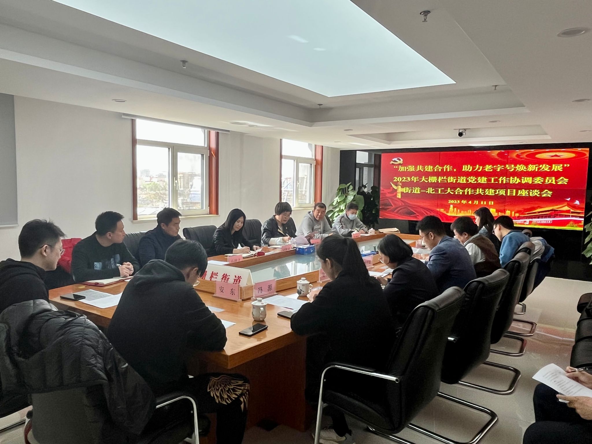 为深入学习贯彻习近平新时代中国特色社会主义思想主题教育和党的二十大精神,统筹推进教育、科技、人才“三位一体”战略部署和公司育人链、创新链和产业链“三链融合”,增强校地联动,街校协同,4月11日,城市建设学部与大栅栏街道工委开展共建活动。大栅栏街道工委副书记付德利、四级调研员郭淑静、党群服务中心主任公祥文、党群工作办公室副科长张希、北京大栅栏金路百货有限公司党支部书记冉增辉、城建学部副主任熊文、党委副书记李佳斌、建筑系副主任李宁、员工工作办公室主任夏佳宁、团委书记石佳、兼职组织员冯源、团委副书记安东、学部博士生、创衣创意设计公司总经理焦泽栋参加会议。活动由大栅栏街道办事处四级调研员郭淑静主持。