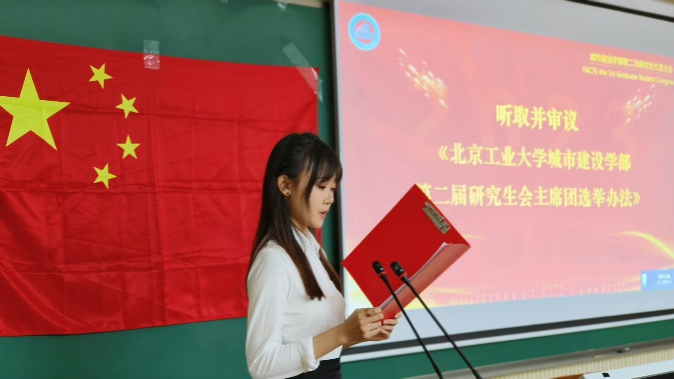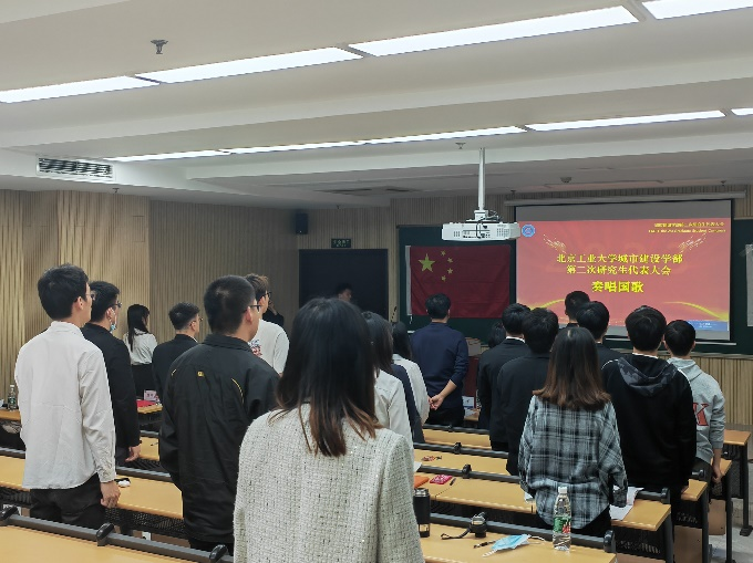 大会在庄严的国歌声中开幕,文法学部研究生会主席刘杨对城市建设学部第二次研究生代表大会的召开表示了祝贺, 并代表校研会对选举等议程开展监督。