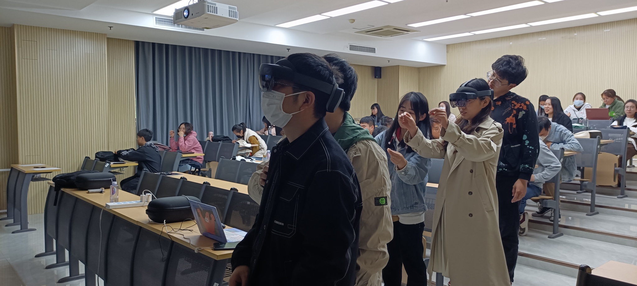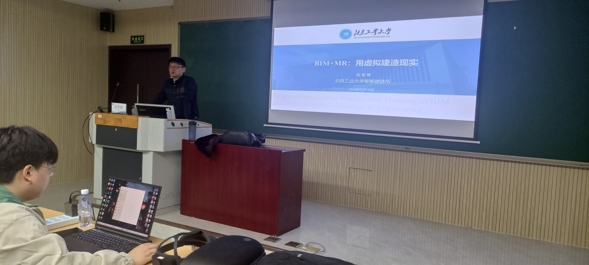 赵雪锋副教授围绕智能建造技术,以《BIM+MR:用虚拟建造现实》为题,深入浅出地讲解了智能建造技术国内发展现状和未来展望,展示了混合现实的原理方法及国内外应用现状。通过雄安新区地下管线工程BIM+MR系统研发及应用、雄安新区园林绿化工程BIM+MR系统研发及应用、基于FEA-MR的工程构件原位实时力学仿真方法研究等实际应用生动形象地展示了相关技术的魅力。在讲到课题基于XR技术的国家重大工程进课堂时,他借此邀请同学们上台亲身感受,他表示,智能建造已成为建筑业发展的必然趋势和转型升级的重要抓手,同学们要理解BIM+MR可以打破数字世界与物理世界屏障,实现BIM中的模型和信息在现场的直接应用,而混合现实将成为下一代BIM应用载体,未来已来,同学们要敢于探索,勇于开拓!