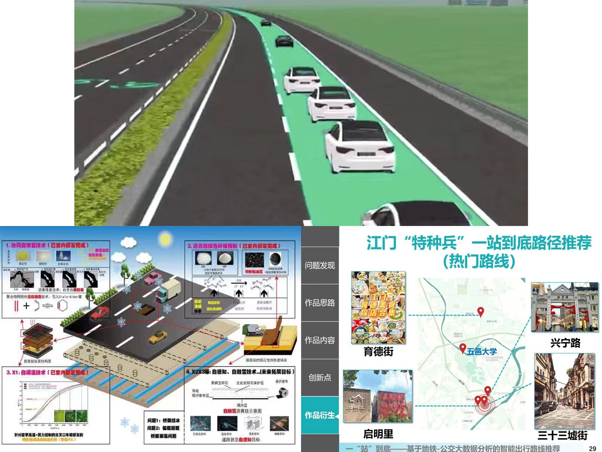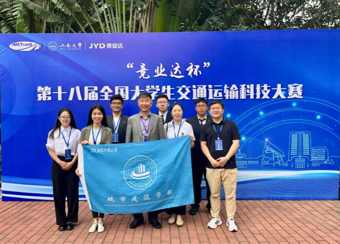 城建学部获得全国一等奖的三个项目分别为fun88官网体育教师孙国强、曹志龙指导的项目《智慧养护——基于“2+X”的绿色预制自修复沥青路面毯》,项目团队通过高掺量复配聚合物改性剂大幅度提升沥青混合料黏韧性,实现沥青毯自由卷曲特性,最终搭建绿色长寿沥青路面毯“2+X”的智慧生态铺装体系;周雨阳、孙立山老师指导的项目《一“站”到底——基于地铁-公交大数据分析的智能出行路线推荐》,项目融合地铁及公交站点的地理坐标数据、客流数据以及周边兴趣点数据,基于WebGis开发了动态网页及APP软件,实现公共交通出行服务高效、便利、动态化的高质量发展;赵晓华、边扬老师指导的项目《“绿色长廊”——面向生态驾驶的网联混驾编队测试系统》,项目团队利用驾驶模拟技术搭建网联自动驾驶编队测试研究平台,形成网联自动驾驶编队多维人因测试系统,并开展网联自动驾驶混驾编队进行生态性验证。
