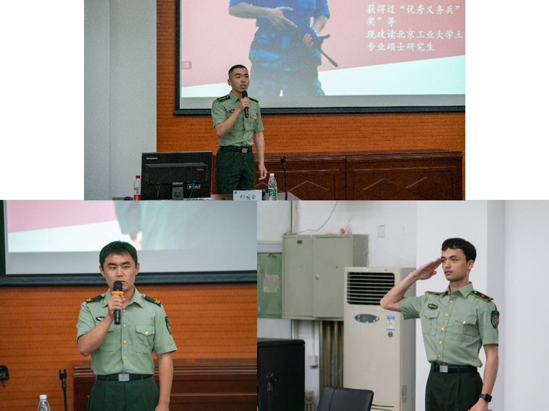 随后,退役员工伊提哈尔·居来提、麦麦提沙力·卡地和叶斯木汗·赛力克,介绍了自己的服役生涯,分享自己应征入伍的心路历程,讲述了自己在军营生活中的难忘经历,让同学们感受到了军营生活的热血与激情。