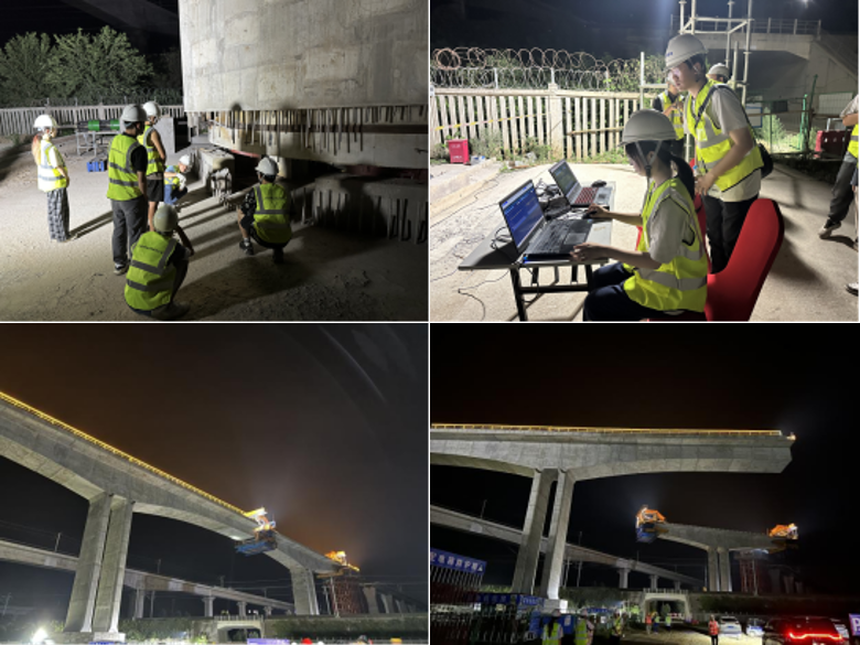 实践团队7人现场参与转体桥转体全过程,协助工程项目组,通过对梁端振动加速度的测定进行转体桥转中安全监测工作。该转体桥于7月19日凌晨进行试转,20日凌晨2时许,顺利完成转体。该实践团项目,在2023年“挑战杯”首都老员工课外学术竞赛中,荣获全校唯一主赛道特等奖。通过本次对理论成果的再次实践应用学习,团队将继续改进研究成果,将理论研究、数值模拟与工程实测相结合,在工程实践中优化理论体系。