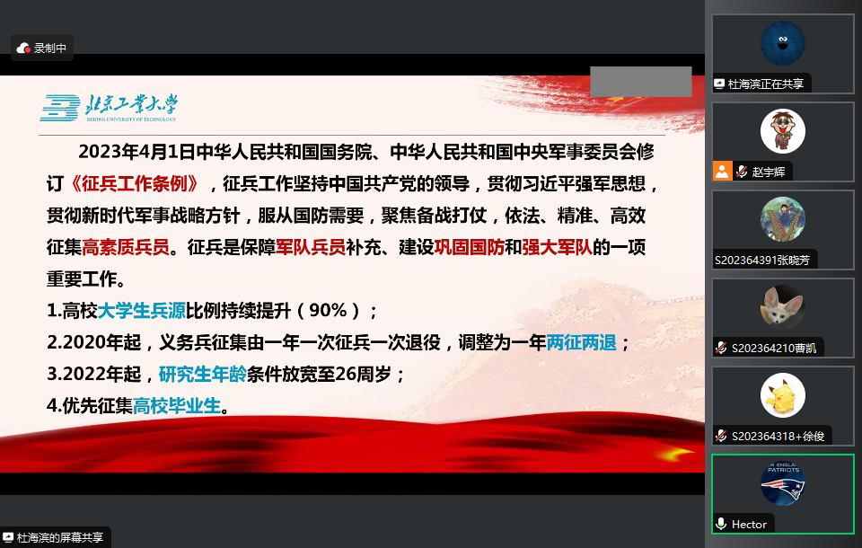 会议伊始,杜海滨老师介绍征兵相关政策,从报名条件、报名方式、优待政策以及入伍流程等方面,结合城建学部员工特点为同学们进行一一解读。杜老师清晰详细的讲解解答了同学们的疑惑,他鼓励同学们响应国家号召,投身军营、建功立业,以青春热血砥砺爱国情怀。