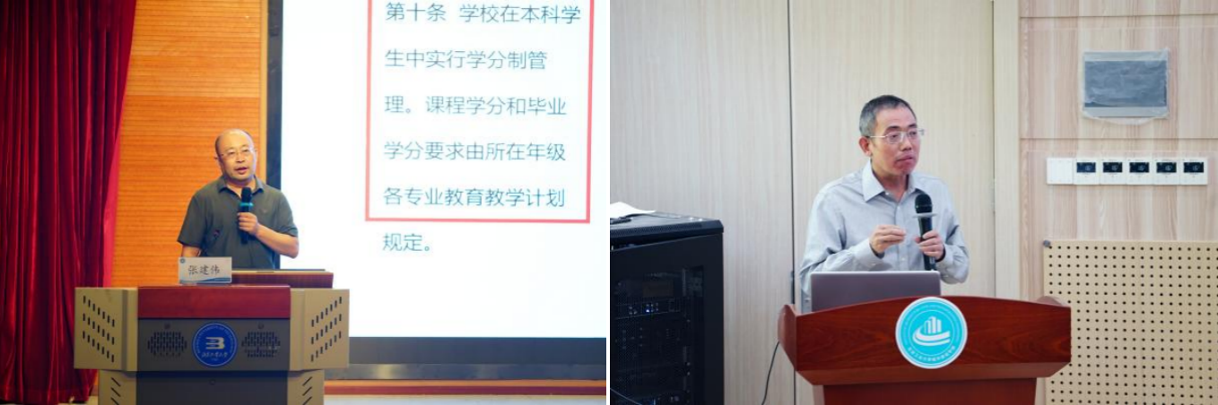 接下来,学部副主任张建伟、韩强分别对本科生及研究生学籍管理规定进行了详细解读。涵盖入学注册、学制与学分、考核、辅修双学位、学位授予等20余条目,同时就城建学部员工学业特殊情况进行讲解。同学们对各培养环节流程有了清晰认知,明确了发展方向,激发了开拓创新意识。