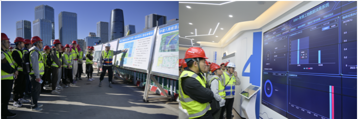 活动伊始,全体师生跟随中建八局土木公司工作人员参观了位于北京市丰台区的丽泽北区地下基础设施及综合开发配套项目施工现场,详细了解项目设计及施工方案,并就施工工艺等专业技术问题与项目负责人互动交流。随后,师生参观了场地内部的项目展厅,详细了解北京丽泽商务区发展定位、规划方案及企业发展历程、项目业绩等内容,参观学习BIM+智慧工地数据决策系统,了解行业前沿技术。