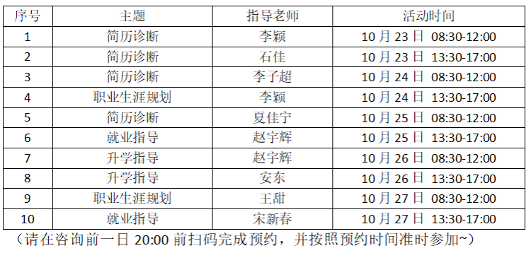 “就业服务周”期间,学部为毕业生提供全方位“一对一”深度辅导咨询。开设简历诊断、生涯规划、就业指导、升学指导四个主题版块,采用轮值制度为毕业生提供全时段的咨询服务,毕业生通过小程序自主在线预约,累计服务员工30余人次。