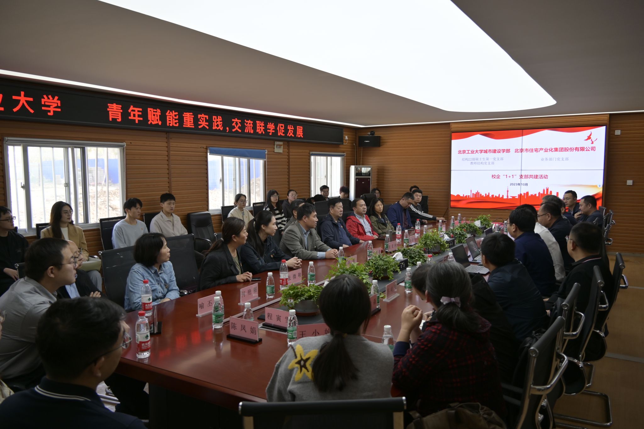 为深入学习贯彻习近平新时代中国特色社会主义思想,以教育、科技、人才“三位一体”的战略思维统筹推进各项工作,提升党建工作水平,促进产学研深度融合,10月25日,城建学部师生党支部与北京市住宅产业化集团业务部门党支部联合开展“青年赋能重实践,交流联学促发展”红色“1+1”共建活动。住宅产业化集团工程技术总师王继生、设计研究院副经理滕志刚、城建学部张爱林教授、薛素铎教授、刘学春教授以及员工工作办公室负责老师参加,活动由住宅产业化集团钢结构总师、业务部门党支部苏磊主持。