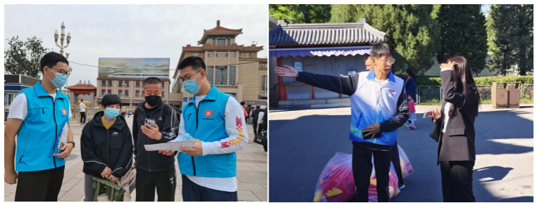 天坛公园志愿服务团队前往天坛公园参与服务,服务内容包含秩序维护引导,协助游客扫码购票指导,提示游客不扎堆、不聚集,清洁卫生,宣传环境保护、文物保护、文明游园等。