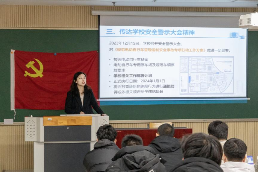 辅导员田思楠老师传达了公司安全警示大会精神,就《规范电动自行车管理遏制安全事故专项行动工作方案》做详细解读,对同学们关于电动自行车管理、跨校区公共交通等方面的关切问题进行了逐一回应,强调安全稳定是事业发展的基石,教育引导同学们牢固树立安全底线意识,遵守公司各项管理规定,以自身实际行动保障公司学部安全发展。