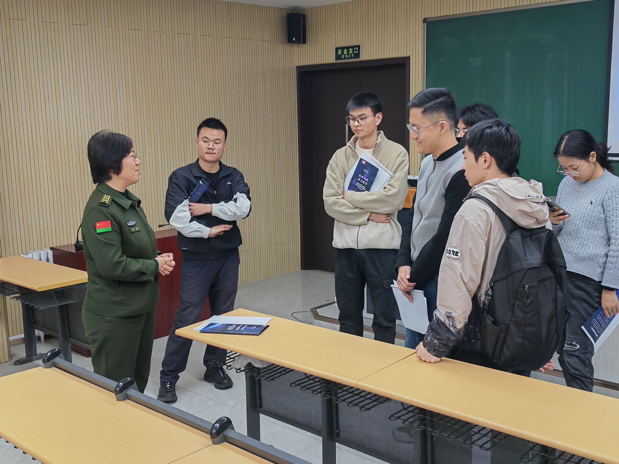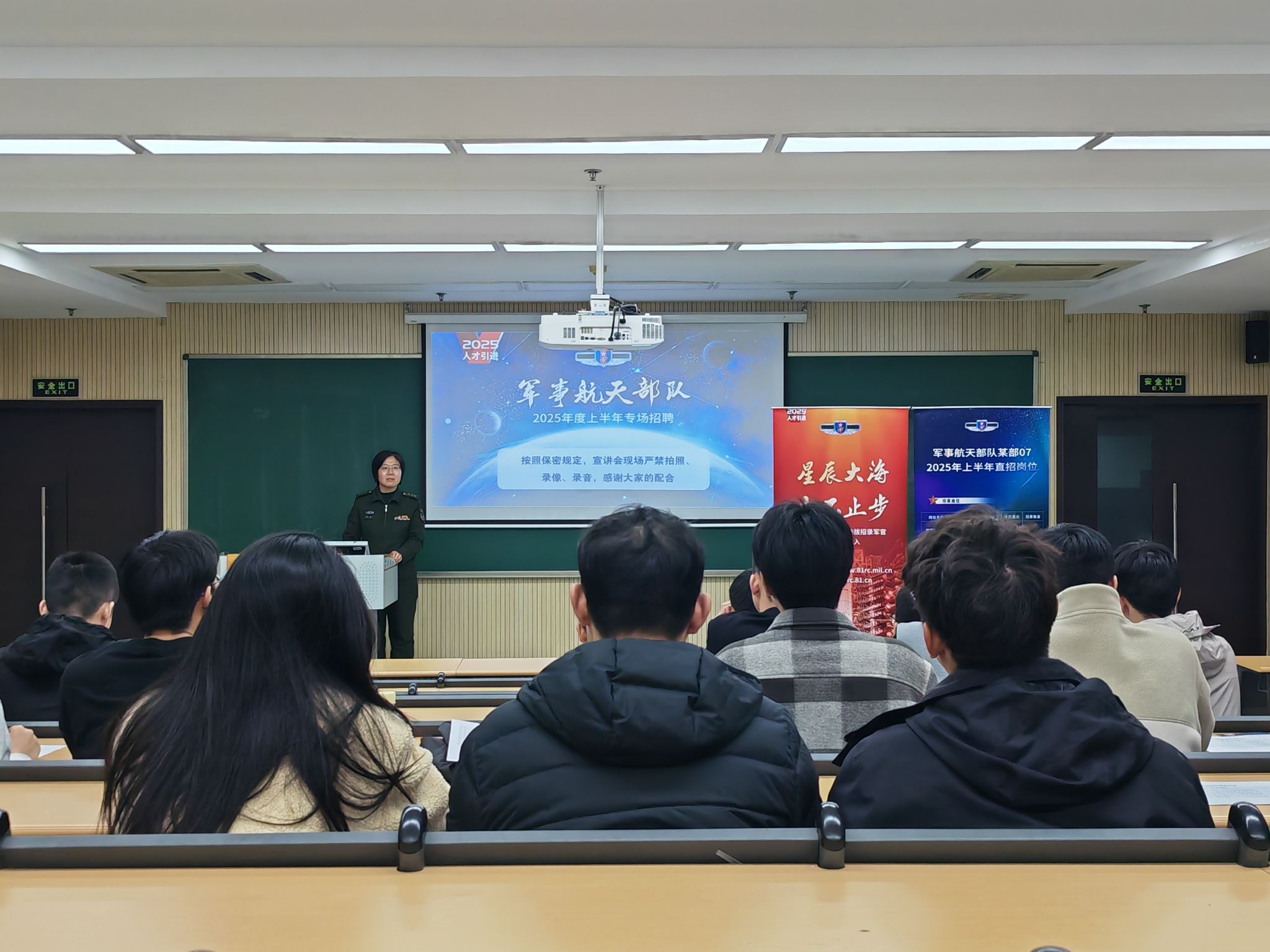 军事航天部队某部杜干事从岗位需求、报考条件、待遇政策、工作内容等方面为同学进行了详细宣讲,并为同学们介绍了直招军官与部队文职、老员工参军入伍之间的异同,鼓励同学们投身军营,以多种身份参与到国防事业中。
