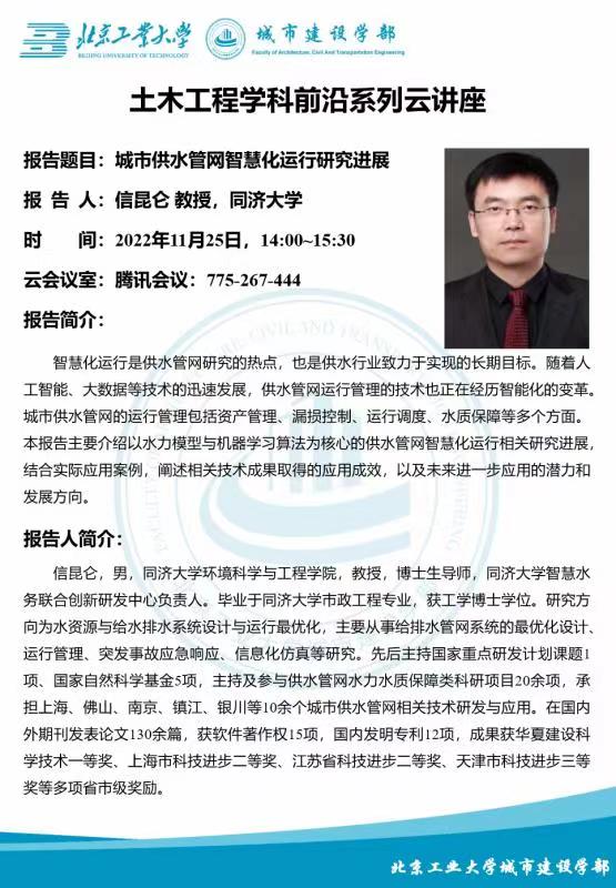城市建设学部土木工程学科前沿系列云讲座—城市供水管网智慧化运行研究进展