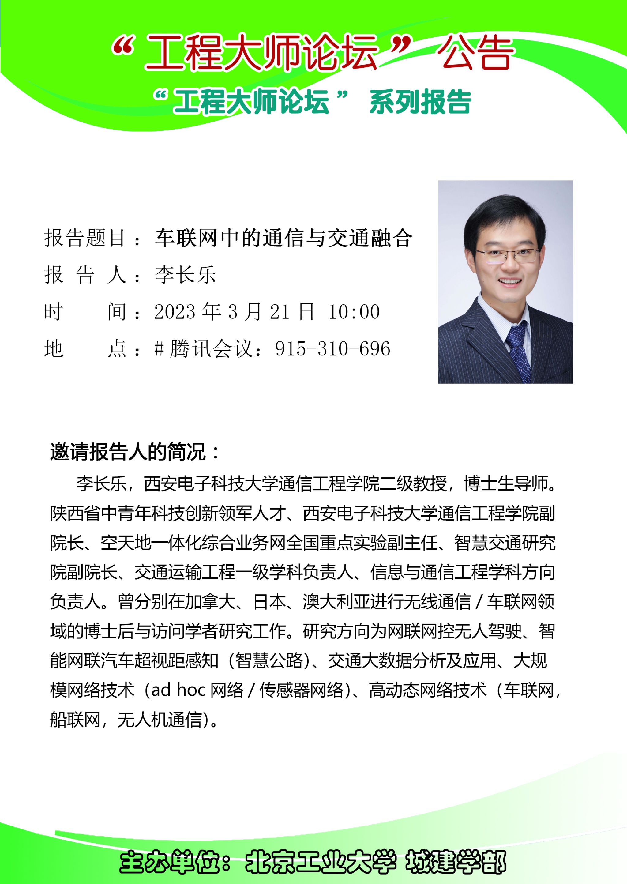 城市建设学部“工程大师论坛”系列报告-车联网中的通信与交通融合