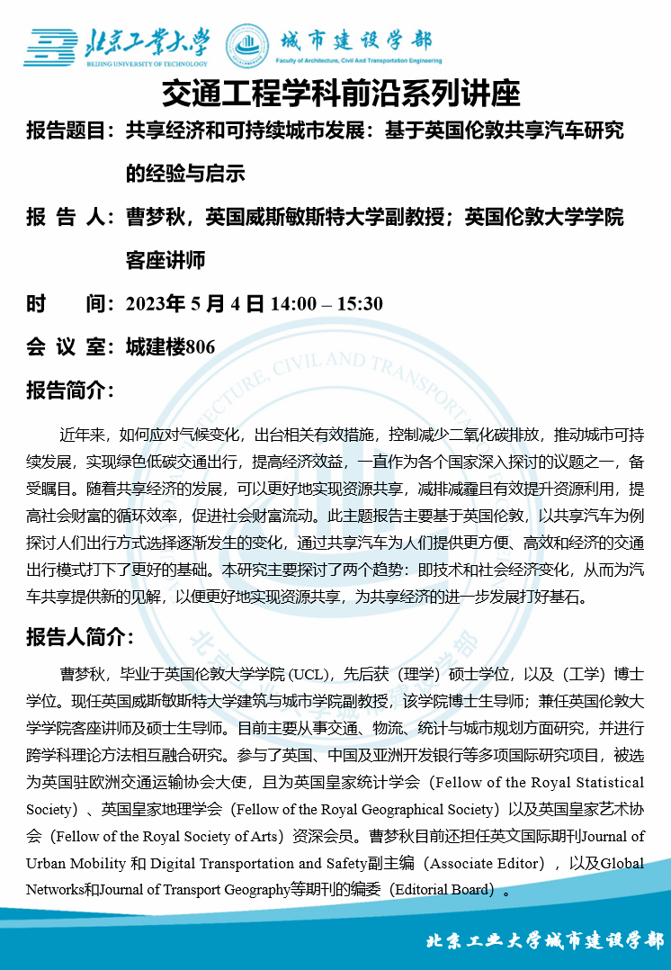 【城建 · 学术报告】城市建设学部交通工程学科前沿系列讲座-共享经济和可持续城市发展:基于英国伦敦共享汽车研究的经验与启示