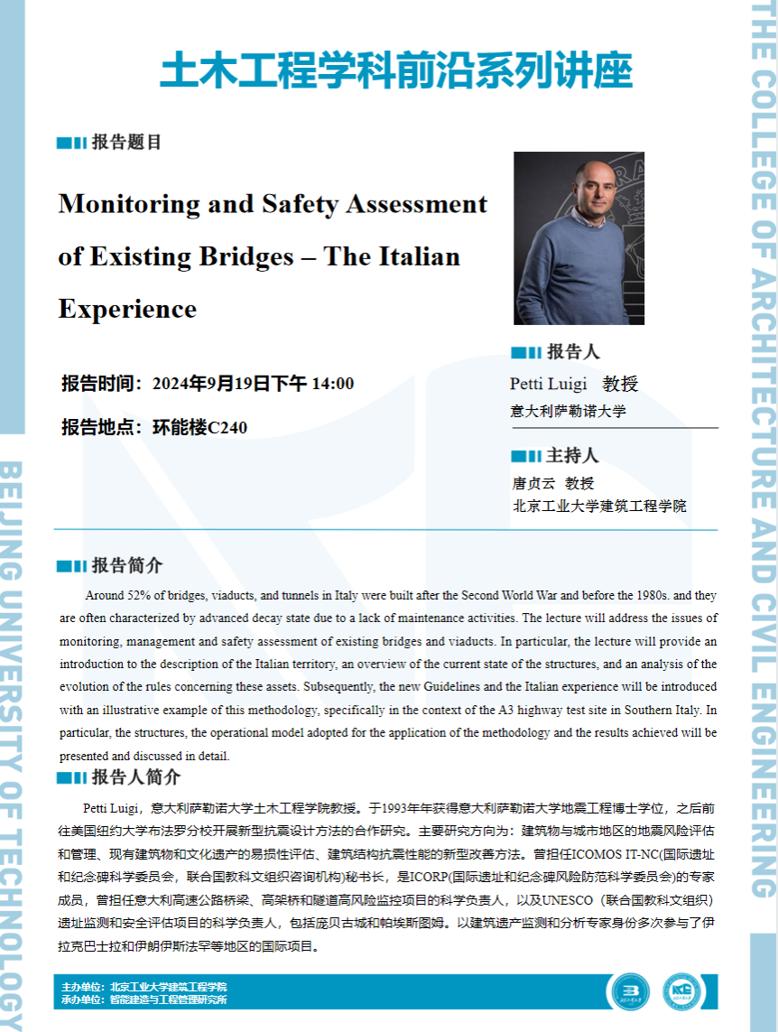 【建工 | 学术报告】土木工程学科前沿系列讲座——Monitoring and Safety Assessment of Existing Bridges — The Italian Experience