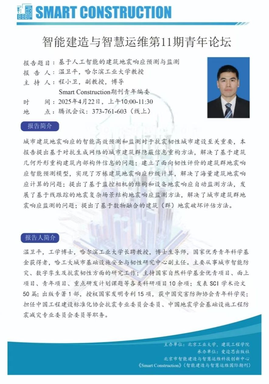 上一条:【建工 | 学术报告】《Smart Construction》智能建造与智慧运维学术前沿第8期——地下工程智能建造与智慧运维技术进展及应用探索
