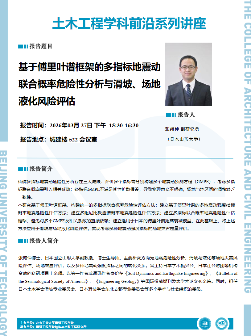 上一条:【建工 | 学术报告】土木工程学科前沿系列讲座——Life-Cycle of Aging Bridges Considering Future Climate:Models, Experiments,and Applications