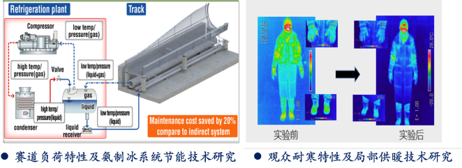 陈超教授团队结合相变蓄热技术研究成果,开展关于2022年北京冬奥会三大赛区观众露天观赛局部热舒适条件改善技术研究。王伟教授团队结合空气源热泵技术研究成果,开展关于2022年北京冬奥会延庆赛区人工赛道制冰系统调控技术研究。承担国家重点研究计划“科技冬奥”重点专项“人工剖面赛道类场馆新型建造、维护与运营技术(2018YFF0300200)”2项子课题研究任务,为北京2022年冬奥会雪车雪橇赛道制冰系统节能运行、营造观众席舒适热环境提供关键技术支撑。