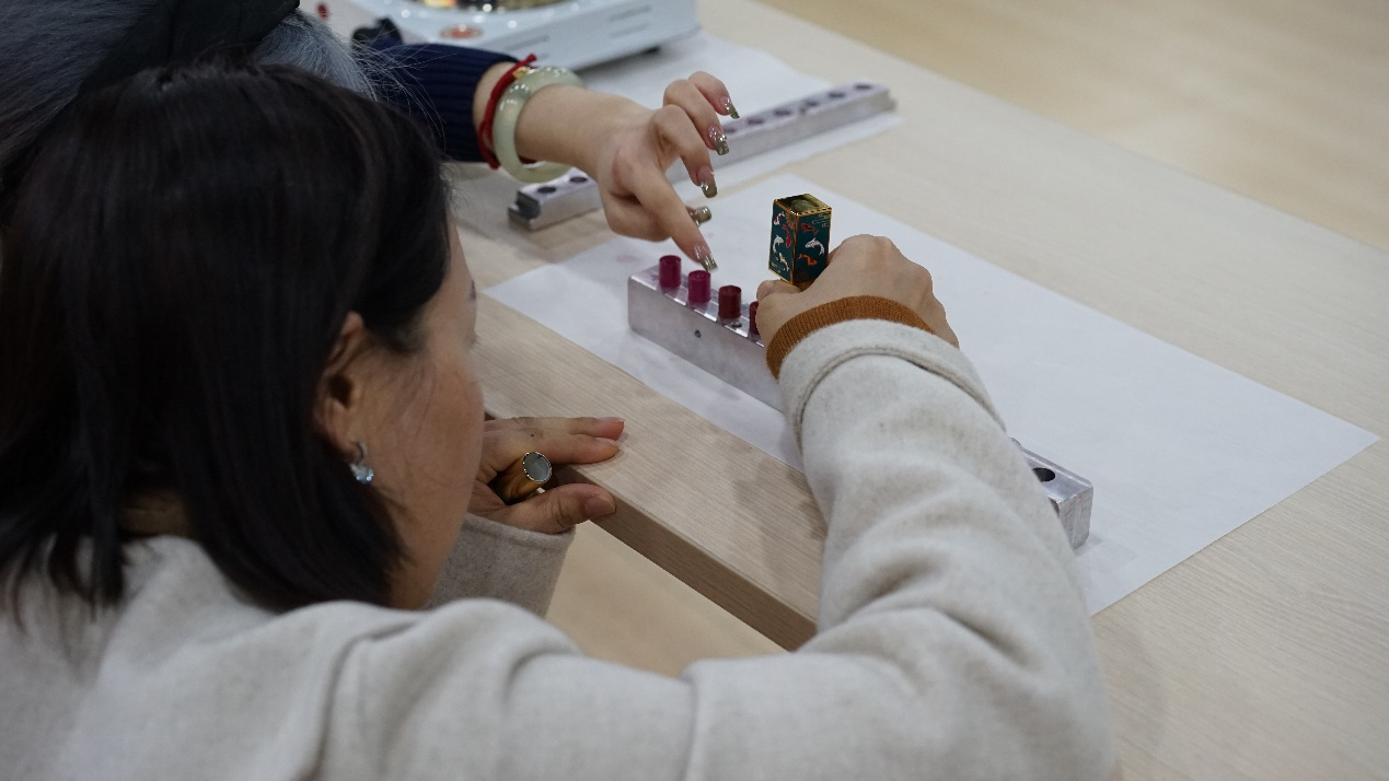 在轻松愉快的氛围中,大家挑选色号,调配精油,有条不紊地消毒、加色粉、加蜂蜡,而后加热、罐装、凝固,认真地制作专属自己的个性口红,尽情体验手工制作的喜悦。