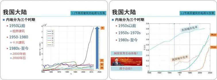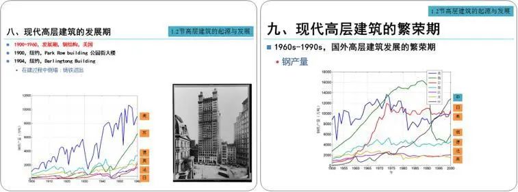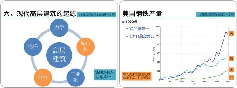 本课程用详实的数据把制度优势在这个领域的具体表现展示给员工,将制度自信元素自然而然融入课堂教学中。在讲授高层建筑的起源与发展内容时,先给出主要资本主义国家在钢材产量和城市化率随时间变化的发展历程。